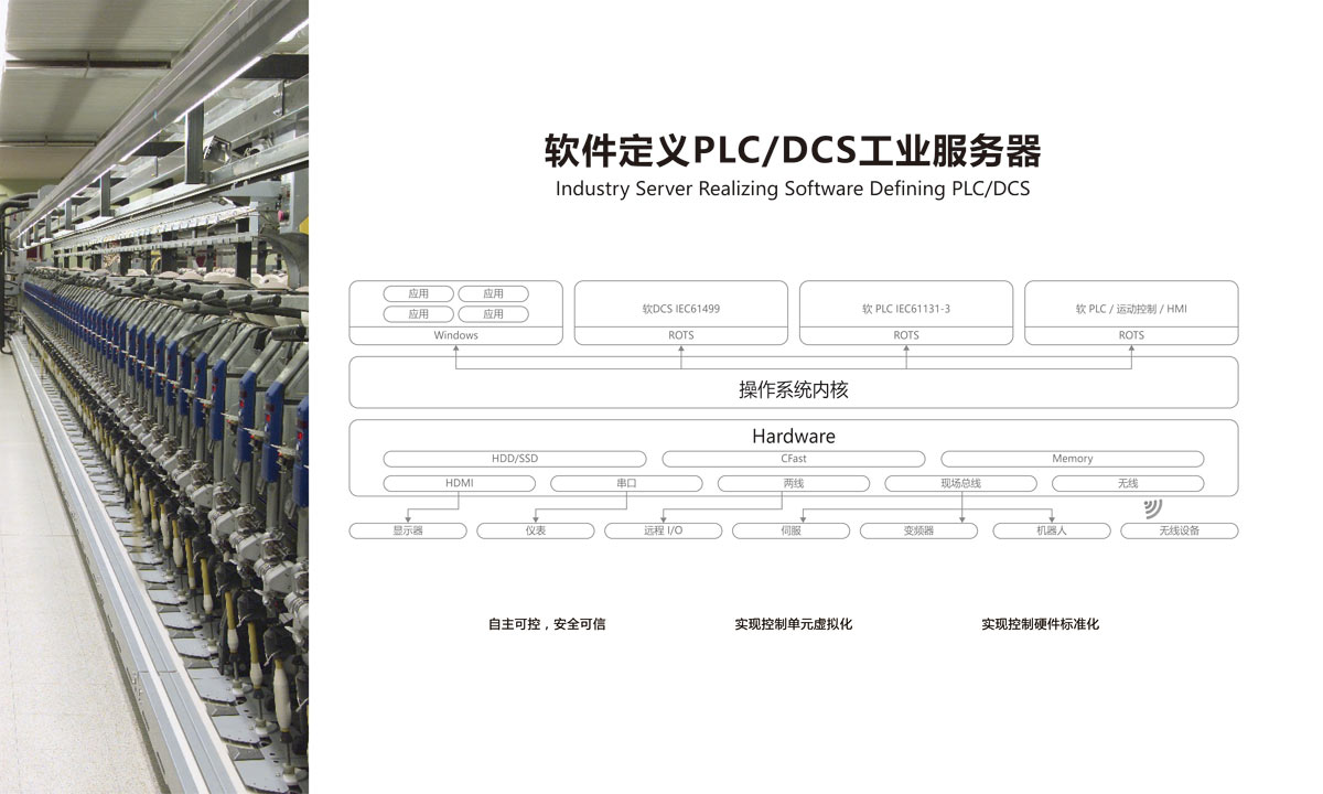 工業(yè)服務(wù)器采用了自主可控的現(xiàn)場(chǎng)高實(shí)時(shí)操作系統(tǒng)內(nèi)核和創(chuàng)新的現(xiàn)場(chǎng)寬帶工業(yè)總線芯片,以互聯(lián)互通和IPV6技術(shù)實(shí)現(xiàn)一網(wǎng)到底,將狀態(tài)感知、傳感器采集、現(xiàn)場(chǎng)控制與工業(yè)網(wǎng)絡(luò)一體化融合,通過(guò)將PLC/DCS等傳統(tǒng)控制系統(tǒng)軟化實(shí)現(xiàn)對(duì)工業(yè)流程的軟件定義。將極大的精簡(jiǎn)傳統(tǒng)的控制網(wǎng)絡(luò)結(jié)構(gòu),降低工業(yè)現(xiàn)場(chǎng)系統(tǒng)的總成本,提高工業(yè)現(xiàn)場(chǎng)的部署效率。