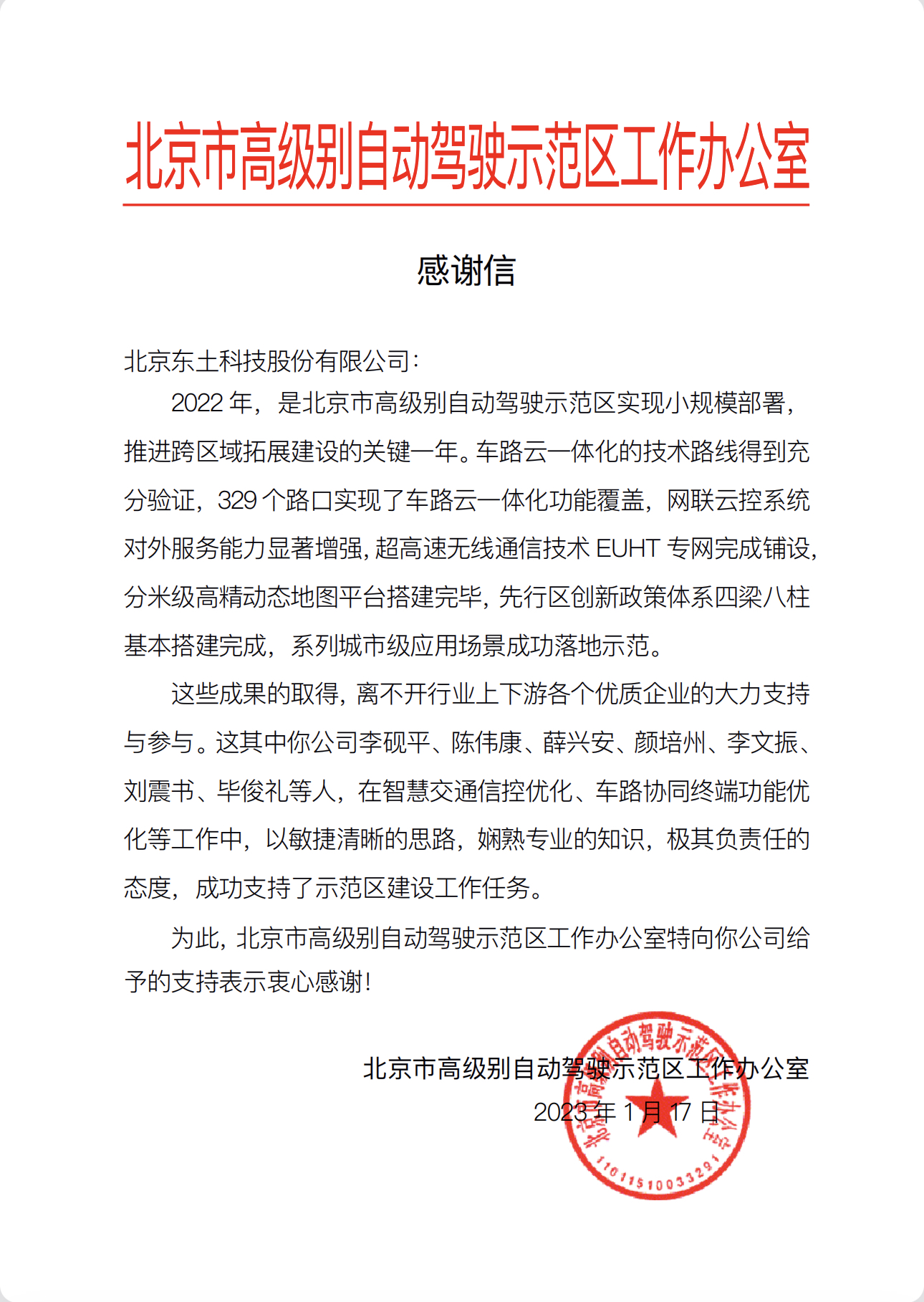 新春佳節(jié)之際,東土科技收到了一份特別的“過節(jié)禮”:公司獲得北京市高級別自動駕駛示范區(qū)工作辦公室的感謝信。這既是對公司智能交通產(chǎn)品及解決方案的肯定,也代表著對公司技術(shù)實力和服務(wù)態(tài)度的褒獎和認可。
