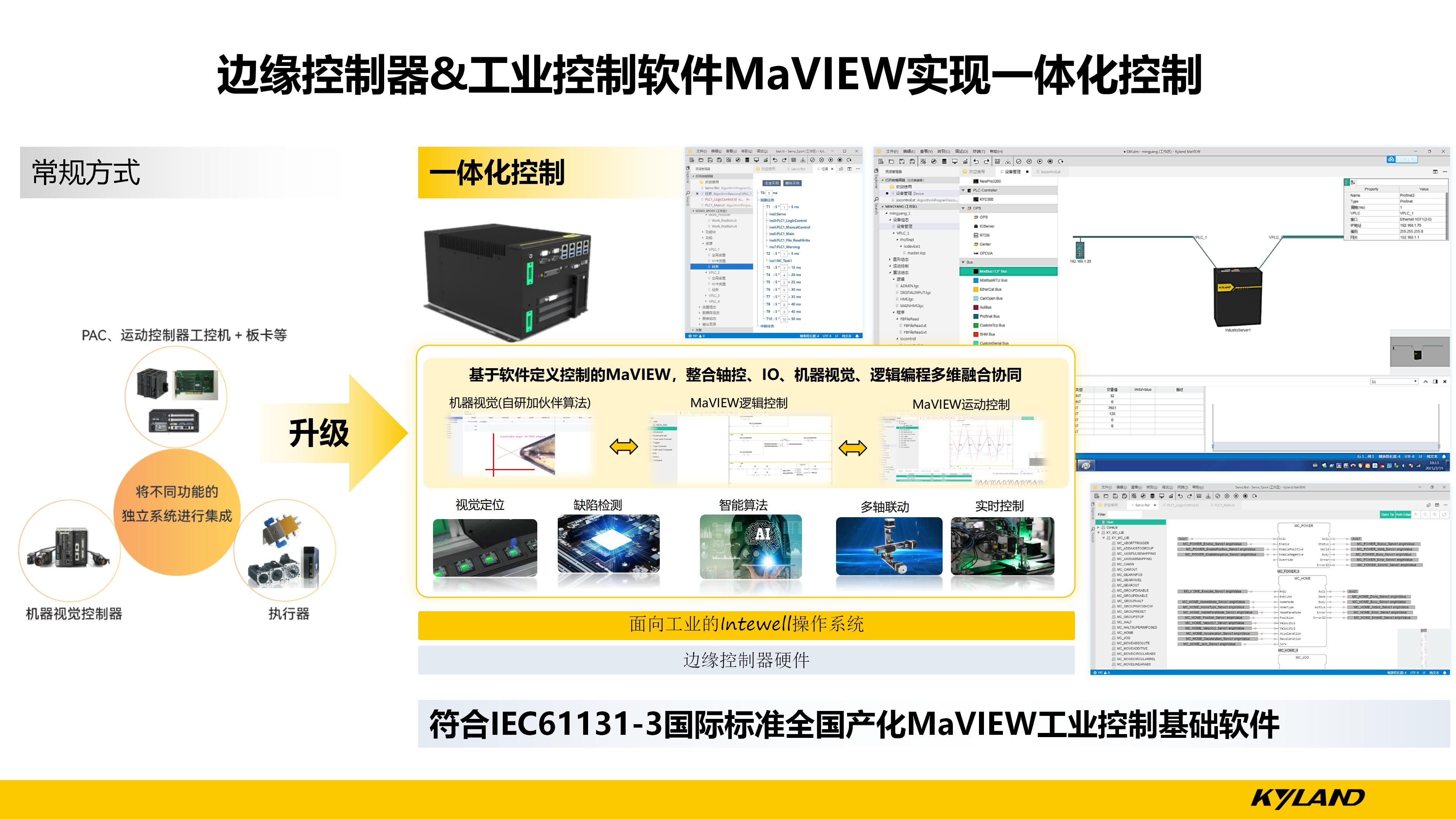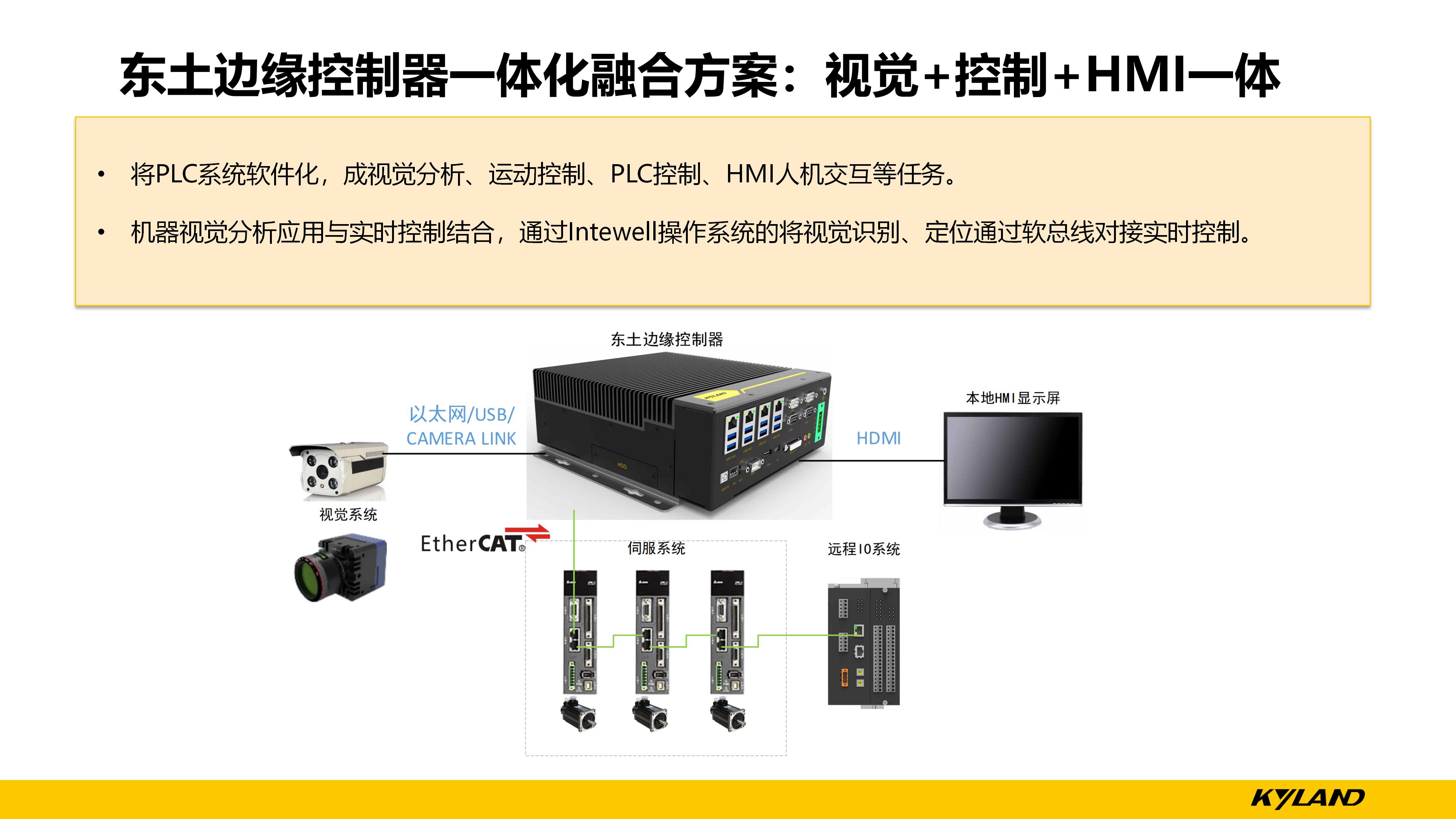 以往常規(guī)方式是工控機(jī)+運(yùn)動(dòng)控制板卡結(jié)合,將不同功能的獨(dú)立系統(tǒng)進(jìn)行集成,但是這樣的方案存在一定的缺點(diǎn),例如,各獨(dú)立系統(tǒng)的數(shù)據(jù)互通效率低下,同步控制效果差,開(kāi)發(fā)時(shí)間長(zhǎng),集成難度大。而東土科技的視覺(jué)+控制+HMI一體化解決方案能夠?qū)LC軟件化,將機(jī)器視覺(jué)分析應(yīng)用與實(shí)時(shí)控制之間通過(guò)Intewell操作系統(tǒng)的虛擬軟總線進(jìn)行數(shù)據(jù)交互,具備數(shù)據(jù)同步快,開(kāi)發(fā)時(shí)間短,集成易維護(hù)等優(yōu)點(diǎn),例如:視覺(jué)定位出來(lái)的物體空間坐標(biāo)位置點(diǎn),通過(guò)虛擬軟總線以變量形式發(fā)送給實(shí)時(shí)控制應(yīng)用,虛擬化PLC就可以快速執(zhí)行控制動(dòng)作,所有數(shù)據(jù)都是在邊緣控制器內(nèi)部完成的,而且比以往的分立式系統(tǒng)減少了空間占用,降低了運(yùn)維難度。