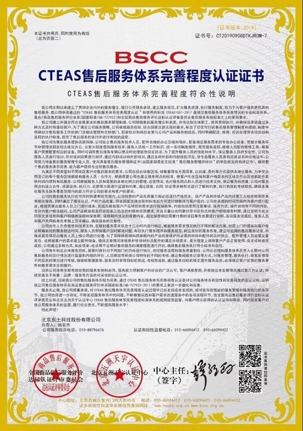 東土科技長期以來建立了貫徹企業(yè)內(nèi)外的服務(wù)理念,履行公開服務(wù)承諾,建立服務(wù)規(guī)范,擴大服務(wù)資源,執(zhí)行服務(wù)制度,致力于為客戶提供更優(yōu)質(zhì)的售后服務(wù)。東土科技申請通過的“ CTEAS售后服務(wù)體系完善程度認證”和使用的標準 CTEAS1001-2017是規(guī)范售后服務(wù)體系完善情況的專業(yè)標準體系是在《商品售后服務(wù)評價體系》國家標準(GB/T27922)和全國商品售后服務(wù)評價達標認證評審委員會售后服務(wù)系統(tǒng)標準之上的更高要求。