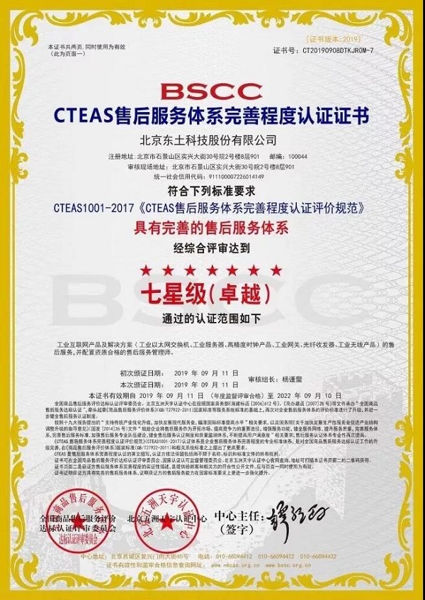 2019年9月11日,在工業(yè)互聯(lián)網(wǎng)產(chǎn)品及解決方案(工業(yè)以太網(wǎng)交換機、工業(yè)服務(wù)器、高精度時鐘產(chǎn)品、工業(yè)網(wǎng)關(guān)、光纖收發(fā)器、工業(yè)無線產(chǎn)品)領(lǐng)域,東土科技率先獲得CTEAS售后服務(wù)體系完善程度認證七星級卓越證書(符合CTEAS1001-2017售后服務(wù)體系完善程度認證評價規(guī)范),這標志著東土科技具有完善的售后服務(wù)體系及在全國全行業(yè)范圍的服務(wù)領(lǐng)先性。