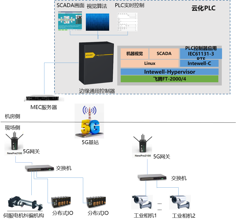 云化控制:引入邊緣計算的系統(tǒng)架構,將Intewell工業(yè)操作系統(tǒng)、軟件定義控制的視覺算法、運動控制整合到MEC平臺,將傳統(tǒng)工業(yè)控制硬件云化為5G MEC邊緣云軟件系統(tǒng)。