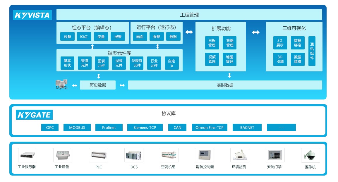 KyVista工業(yè)互聯(lián)網(wǎng)全景可視化集成平臺(tái)針對工業(yè)領(lǐng)域多種主流協(xié)議如Modbus (Serial Line and TCP)、OPC XML-DA、OPC UA 、Profibus、Profinet等,進(jìn)行數(shù)據(jù)采集及轉(zhuǎn)換,實(shí)現(xiàn)工業(yè)數(shù)據(jù)的采集、處理、存儲(chǔ)、遠(yuǎn)程配置與監(jiān)控、分析及圖形化展示,并做出智能分析、預(yù)警,靈活支持各種工業(yè)應(yīng)用。