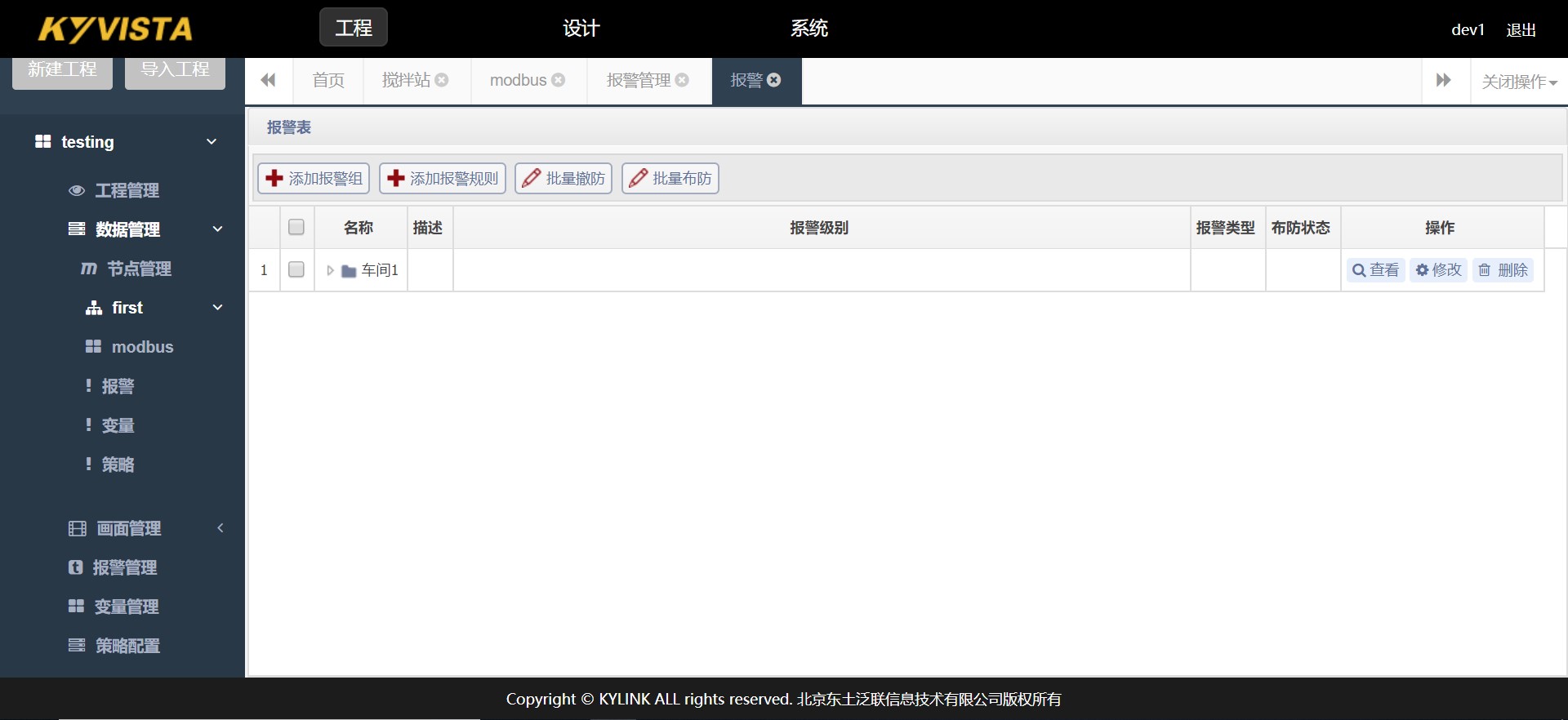 | 報(bào)警管理 | 支持用戶自定義表達(dá)式報(bào)警規(guī)則 根據(jù)規(guī)則產(chǎn)生報(bào)警,支持報(bào)警復(fù)位 ![]() |