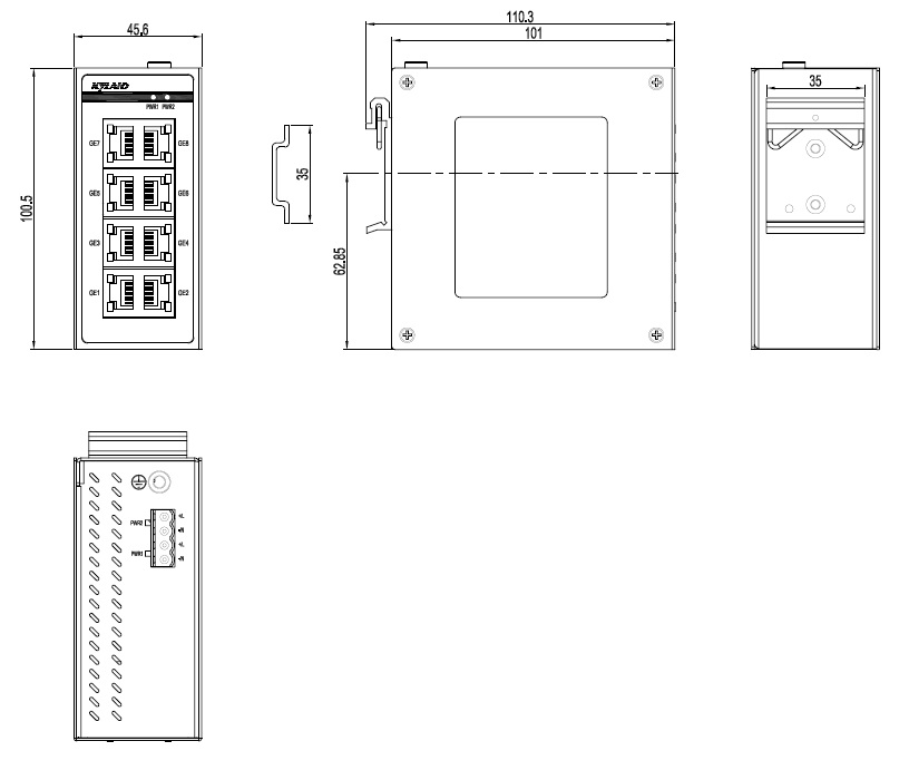 Opal8G-8GE-LV-LV-W 8×10/100/1000Base-T(X) RJ45電口 12-48VDC/18-30VAC, 冗余輸入 45.6mm×100.5mm×101mm