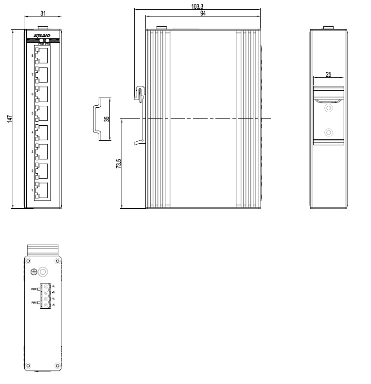 Opal8G-8GE-LV-LV 8×10/100/1000Base-T(X) RJ45電口 12-48VDC/18-30VAC, 冗余輸入 31mm×147mm×94mm