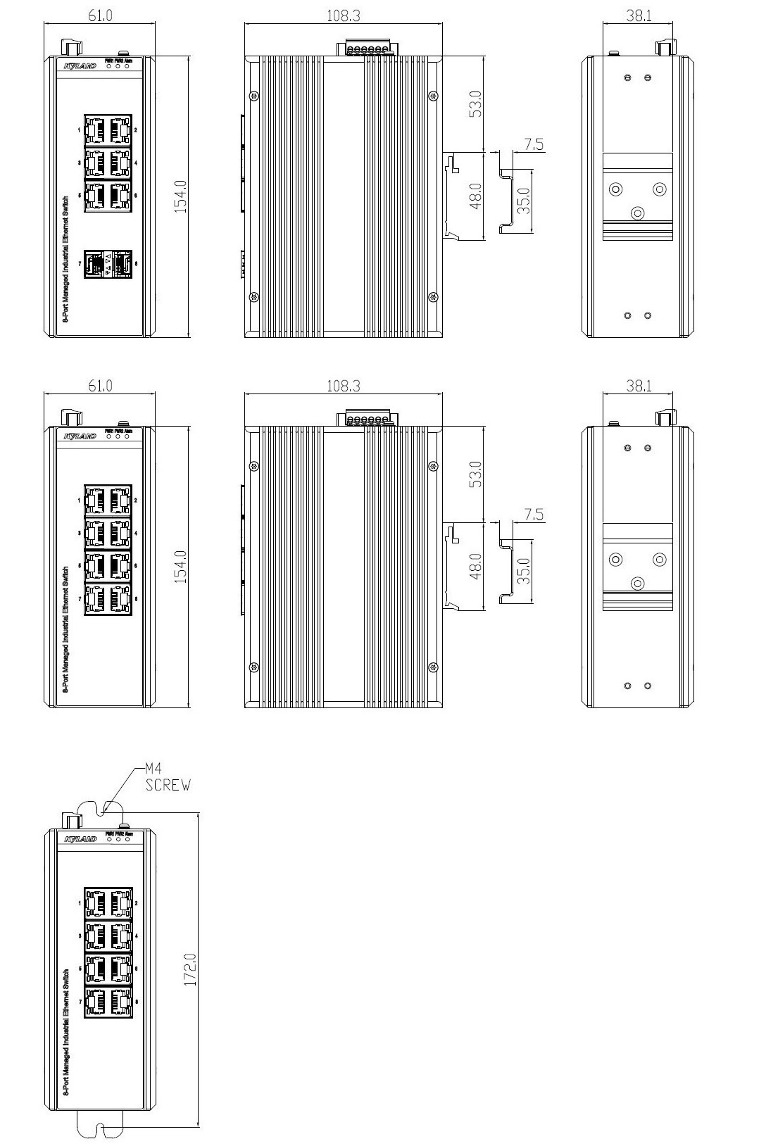 | 機械結構 | 外殼 金屬材質 散熱方式 自然冷卻,無風扇 防護等級 IP30 尺寸 108x154x61mm(W×H×D) 重量 1.3Kg 安裝方式 DIN卡軌式或壁掛式 |